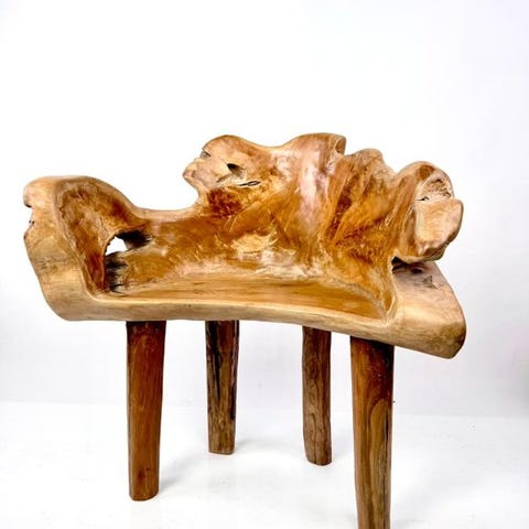 Lille håndformet skammel. Denne stol i træ fra det 20. århundrede, der minder om en hånd, er inspireret af Pedro Friedebergs arbejde, en mexicansk kunstner og designer af italiensk oprindelse, kendt for sine surrealistiske værker. Fremstillet af massivt træ har den revner og knuder hist og her. Stolen er i fremragende stand med mindre tegn på slid.
