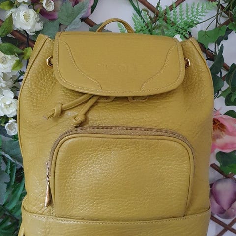 Gucci Bamboo vintage ryggsekk i liten størrelse. Materiale: ruskind/læder. Farve: gul. Bambushåndtag. Indvendigt med hovedrum og en lynlåslomme samt vedhæng af forgyldt metal. Mål: 22 cm (bredde) x 22 cm (højde) x 7 cm (dybde).