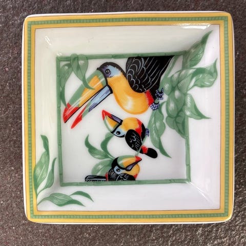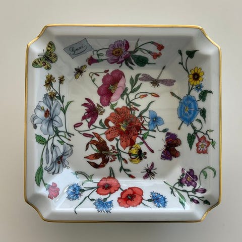 Gucci porcelænsaskebæger fra Italien, cirka 1980’erne, i fremragende stand med let slid, måler 18,5 × 18,5 × 3 cm, med gyldent kant og jæger-/hestesymbolik, mærket Gucci Made in Italy. Klik på den blå "gå til varen" knap, for at købe eller byde på denne vare. Den samlede pris vil blive vist inden du afgiver dit bud.