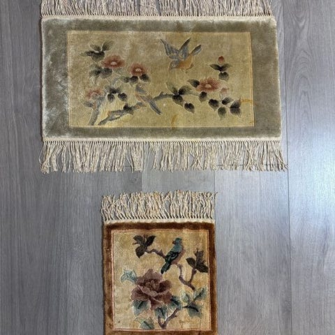 China set 2x, to hånd-knyttede tæpper i uld på bomuld fra Kina, dimensioner 145 × 73 cm, i god generel stand. Klik på den blå "gå til varen" knap, for at købe eller byde på denne vare. Den samlede pris vil blive vist inden du afgiver dit bud.