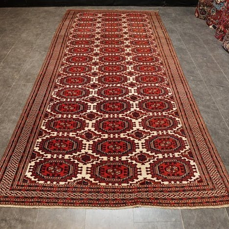 Håndvævet Buchara art deco tæppe fra Pakistan, uld på bomuld, 94 cm × 292 cm, 21. århundrede, i godt overordnet stand med alders- og brugsridser, ægthedscertifikat. Klik på den blå "gå til varen" knap, for at købe eller byde på denne vare. Den samlede pris vil blive vist inden du afgiver dit bud.