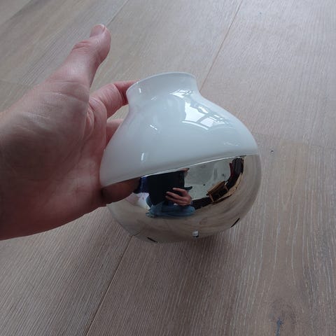 Cook & Baker ægformet skål i hvid keramik/porcelæn med metalfod. Skålen har en åbning foran og rund bagside, formet som et æg. Foden er i metal med Cook & Baker-logo. Velegnet som dekorationsskål eller til servering efter behov.