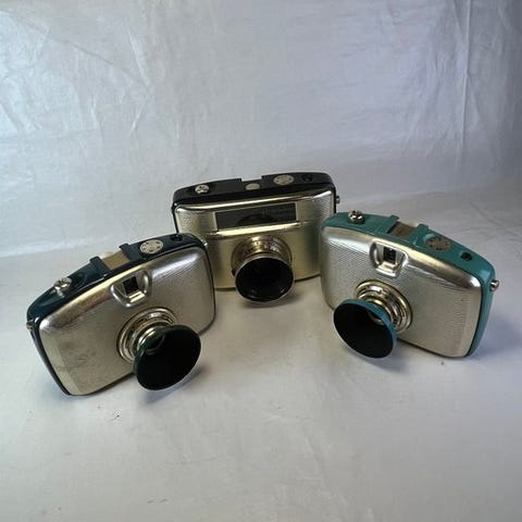 Tre Pentacon Penti II kameraer i aqua, creme og sort, i god fysisk stand og testet fungerende, fra Tyskland omkring 1965. Klik på den blå "gå til varen" knap, for at købe eller byde på denne vare. Den samlede pris vil blive vist inden du afgiver dit bud.