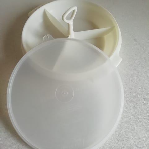 Opbevarings-/serveringsskål, 3 dl., Tupperware, billede 2 og 3 viser funktion med hængeske (skeen er til salg i en anden annonce), billede 4 og 5 viser funktion med æggeskiller/riv (til salg i anden annoncer, samlet pris for 3 bøtter kr. 60,00 eller pr. stk. kr. 25,00