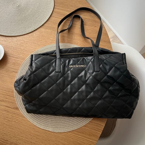 Valentino tas af sort sort læder med hvidt canvas, én størrelse, målene 15,8 cm høj, 12 cm bred og 4 cm dyb, skulderremslængde 64,5 cm, lynlåslukning, brugt i god stand med nogle ridser og slitage. Klik på den blå "gå til varen" knap, for at købe eller byde på denne vare. Den samlede pris vil blive vist inden du afgiver dit bud.