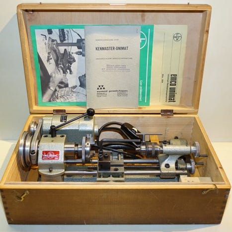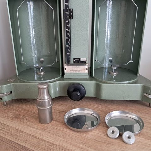 Sjælden bærbar durometer fremstillet af Micro Italiana Milano, beregnet til måling af metalk hardness ifølge Brinell-skalaen. Instrumentet er opbevaret i sin originale træboks, med let slidmærker, typiske for alderen.