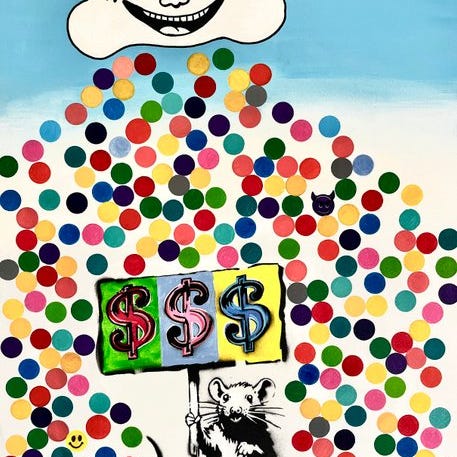 “Hit The Jackpot” er en hyldest til den moderne besættelse af succes, penge og berømmelse. Værket skildrer Richie Rich, evigt symbol på barndommens rigdom, nedsænket i en eksplosion af farver og popreferencer, fra Marilyn Monroe til logos fra den moderne kapitalisme. I baggrunden flettes magtsymboler og digitale formuer sammen med ironien i et samfund, der måler alt i tal og værdier.