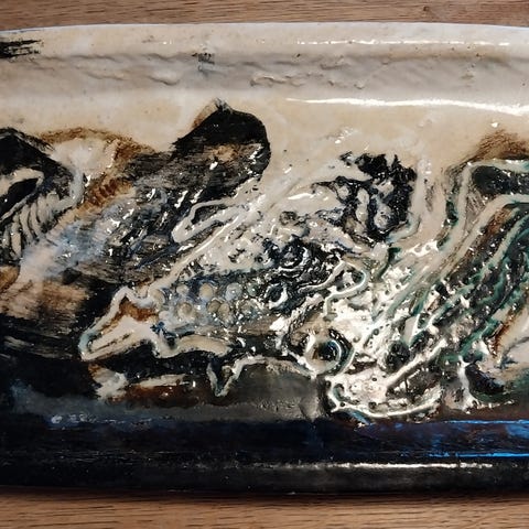 Ophænk/bordfad, Jeppe Hagedorn Olsen, motiv: Abstrakt, UNIKA - for samler. Stort aflangt ophæng/eller fad (huller til ophæng, "fødder" til stand) af Jeppe Hagedorn Olsen, 1960. I smukke, matte farver og med glasur i venstre side og mat i højre side. Med fremstående dekorationseffekt midt på. Et par små nag bagpå. Købt gennem kunstforening i bank for mange år siden. - Fra røgfrit og dyrefrit hjem. størrelse 46 x 34 cm. - .