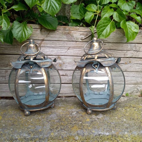 To dekorative lyslygter i metal og glas fra Europa, estimeret periode 2020 eller nyere, målene 26 cm høj, 14 cm bred og 15 cm dyb, i ny tilstand og i funktion, med låge til at sætte en lys eller te-lys. Klik på den blå "gå til varen" knap, for at købe eller byde på denne vare. Den samlede pris vil blive vist inden du afgiver dit bud.
