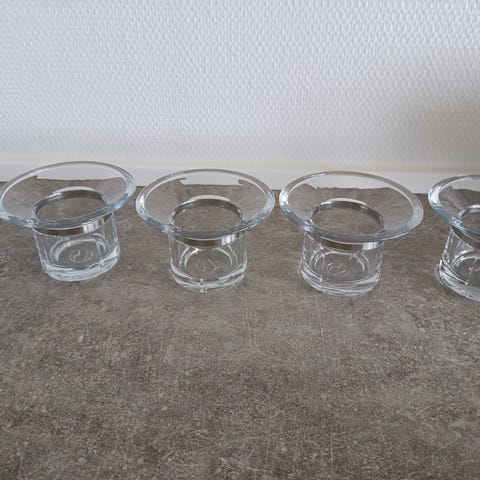 Glas fyrfadsstage i mat grå glas med udskårne træmotiver i siden. Stagen er velegnet til fyrfadslys og kan bruges som dekoration på bord, vindueskarm eller hylde. Størrelsen fremgår af billederne med lineal, så den kan tilpasses eksisterende indretning eller samling af lysestager.