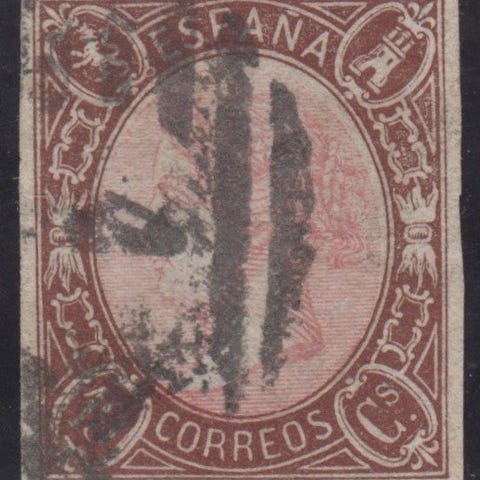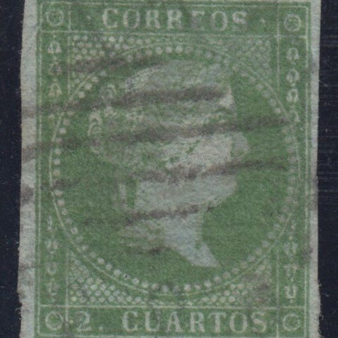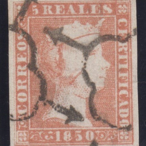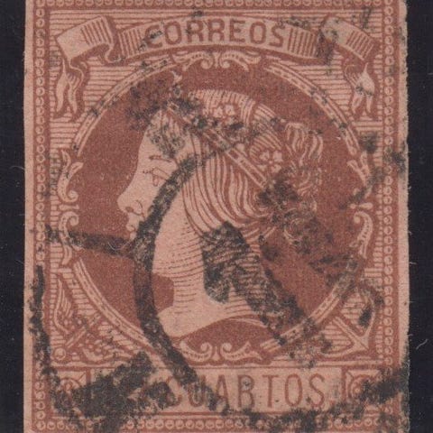 Oprindelse Spanien; Isabel II. 6 reales, blågrøn; brugt, Edifil 16, fra 1852, med ekspertsignatur. Klik på den blå "gå til varen" knap, for at købe eller byde på denne vare. Den samlede pris vil blive vist inden du afgiver dit bud.