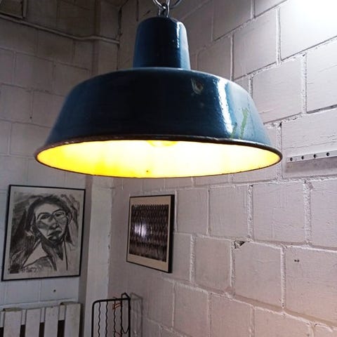 Unikke industriløse/loft-stil lamper til salg. De stammer sandsynligvis fra et værksted eller en industriel facilitet og giver dem en autentisk, rå karakter.