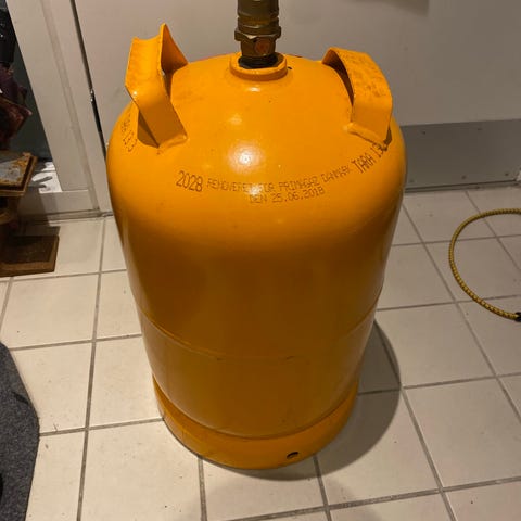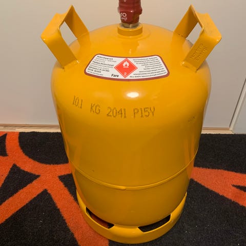 Gul gasflaske i stål med bærehåndtag og ventil i toppen. Egnet til opbevaring og transport af gas, fx til grill, varmeapparater eller andre gasdrevne apparater, hvor korrekt tilslutning og godkendt udstyr anvendes. Kapacitet og præcis gas-type fremgår af mærkaterne på flasken.