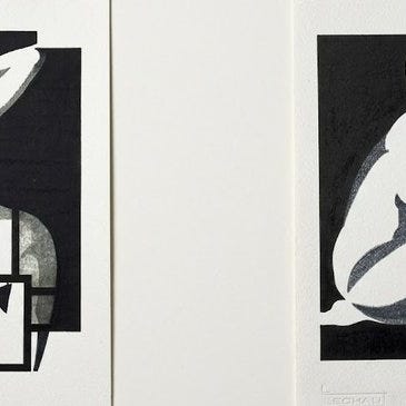 Disse to værker på papir af Eechaut er udført med blæk på papir og fokuserer på rytme, struktur og gentagelse. Sammensatte af lagdelte lineære gitter og overlappende rektangulære rammer, væveset bidrager til arkitektoniske elementer, stilladser eller abstrakte konstruktioner, der svæver inden for billedfladen.