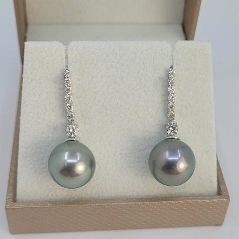 Disse elegante 18K hvidguld ørestikker har et smukt design udsmykket med 0,21 ct diamanter og store strålende ovale sydhavsperler.