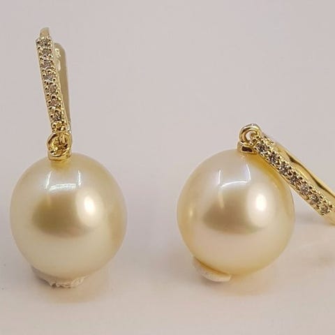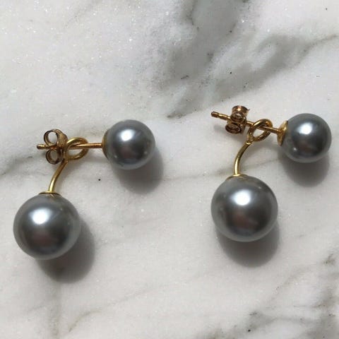 Damesøreringe i 18 kt gult guld med to dråbeperler Tahiti sølvgrøn og Edison hvide ferskvandsperler, ca. 8,5 mm hver, droplængde cirka 2 cm, totalvægt 4 g, ingen laboratorierapport. Klik på den blå "gå til varen" knap, for at købe eller byde på denne vare. Den samlede pris vil blive vist inden du afgiver dit bud.