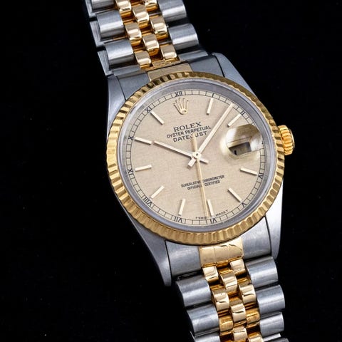 Rolex Datejust 36 Factory Diamond 18k Gold/Steel Anniversary Dial, reference 16233, 36 mm kasse af stål og guld med gyldent urSkive, automatisksværk, lænke i guld/stål, herremodel, fra 1990'erne, i meget god stand med mindre brugsspor og uden original æske eller papirer. Klik på den blå "gå til varen" knap, for at købe eller byde på denne vare. Den samlede pris vil blive vist inden du afgiver dit bud.