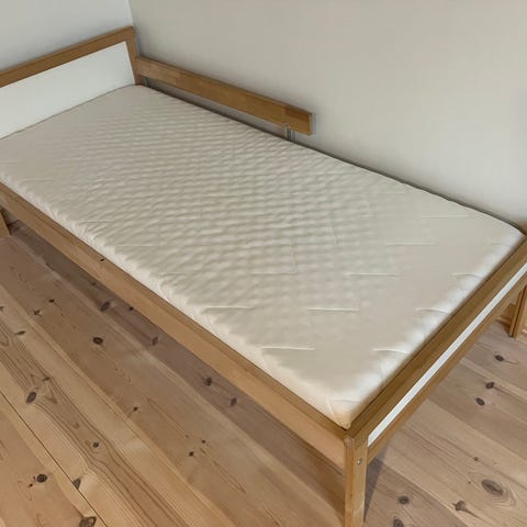 Sengen kan udvides i takt med, at dit barn vokser. Madrassen medfølger og har forlængerstykker, så den også vokser med barnet, den har altid været brugt med vådliggerlagen. Der kan også følge 2 stk vådliggerlagen med (200 cm, foldes ind under madrassen, når man bruger den lille seng) og 2 stk almindelig lagen (passer til den lille seng)