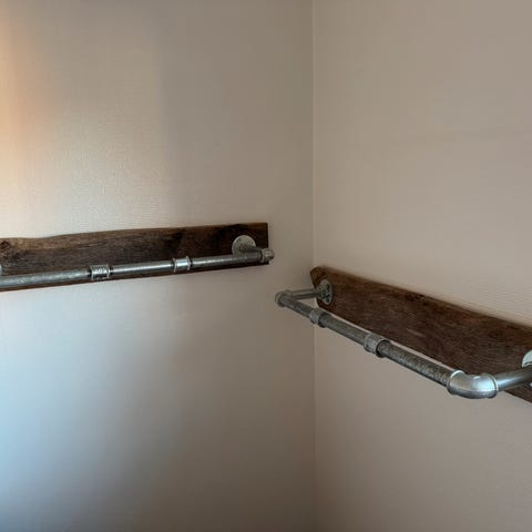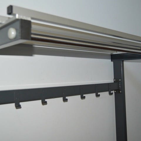 Andet, Stativ i stålrør med trådhylde, 3 bøjllestænger og nederst en tøjpose. Ideel i bryggers eller gang til brug for opbevaring af vanter, huer, tørklæder m.v.. Str. H 140 x B 42 x D 25 cm.