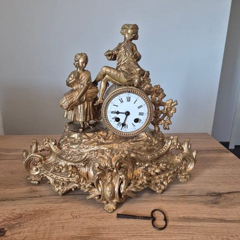 Et schweizisk bordur ur fra 1960-1970 af Imhof, kabinet i forgyldt Messing med florale udskæringer i historiserende barok- og rokoko-stil, mekanisk otte-dages værk, ikke slag, i god brugt stand. Klik på den blå "gå til varen" knap, for at købe eller byde på denne vare. Den samlede pris vil blive vist inden du afgiver dit bud.