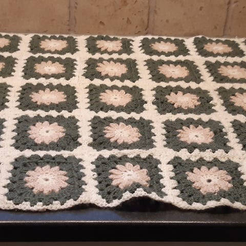 tæppe i hæklet stil med kvadratiske mønstre i flere farver. Velegnet som tæppe til sofa, seng eller lænestol. Materiae og mål er ikke oplyst.