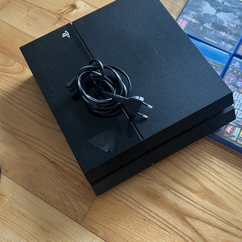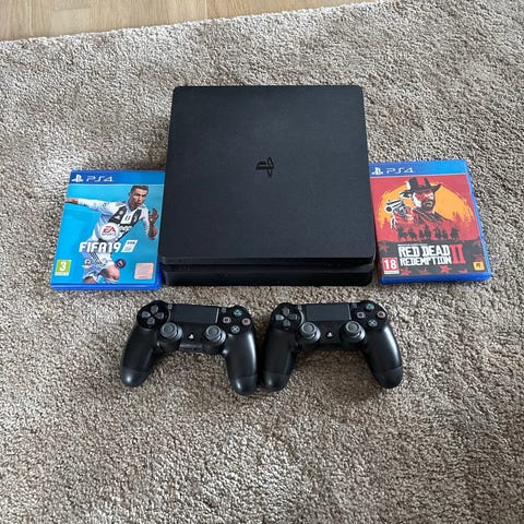 Sony Playstation 4 konsol med to DualShock 4 controllere i sort. Medfølgende spil: Grand Theft Auto V til PS4 & Witcher 3.