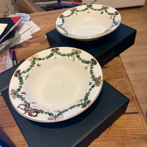 Royal Copenhagen Stjerne Riflet Jul etagere i hvidt porcelæn med juledekoration langs kanten. Etagèren har to tallerkener i forskellig størrelse for oven og forneden, samlet højde ca. 23 cm. Midterstang og beslag er i metal med gylden farve. Velegnet til servering af kager, småkager, konfekt eller andre mindre anretninger på bordet i juletiden.