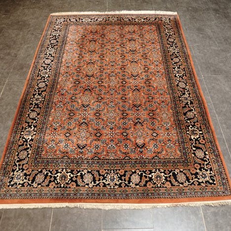 Oprindelse: Indien; håndvævet orientalsk tæppe med uldpels på bomuldsgarn, mål 217 x 152 cm, fra slutningen af det 20. århundrede, i god generel stand, med ægthedscertifikat. Klik på den blå "gå til varen" knap, for at købe eller byde på denne vare. Den samlede pris vil blive vist inden du afgiver dit bud.
