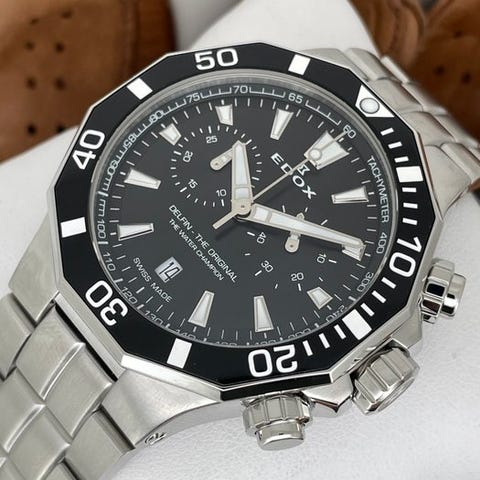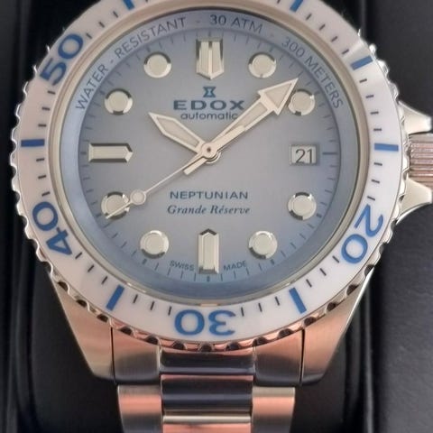 Edox Delfin The Original Day Date Automatic, reference 88008-3CA-NIN, herreur i stål 43 mm, sort skærm, safirglas, schweizisk automatisk kaliber 88, sort gummiarmbånd, ny tilstand, original kasse inkluderet, ingen original papirer, original garanti inkluderet, forsendelse forsikret. Klik på den blå "gå til varen" knap, for at købe eller byde på denne vare. Den samlede pris vil blive vist inden du afgiver dit bud.
