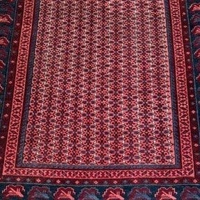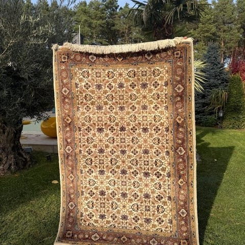 Et orientalsk håndknyttet tæppe i uld uden centralt medaillon. Meget blomsterfyldt og afsluttet med en stor blomsterkant.