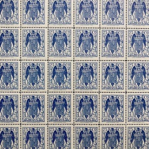 Pragtfuldt komplet ark med 50 frimærker. 15 øre. Edifil-kataloget over spanske skattefrimærker Alemany nr. 110 (2.500€). Nye med gummi 000.000 på bagsiden. Meget sjældne.