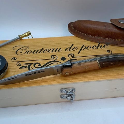 Laguiole Le Rustique læder- eller oliventræ-foldekniv i en smuk kiste med slibestål, bælteetui og fedt til at vedligeholde kniven