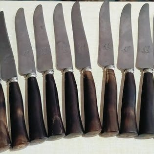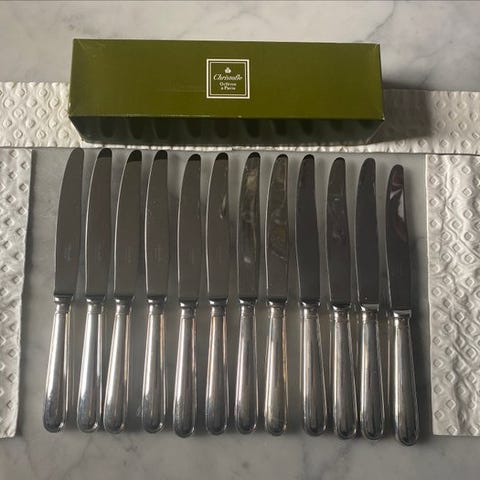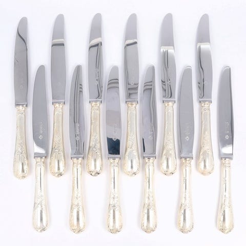 Set af 8 fiskeknive Christofle model Spatour i sølvfarvet metal med våbenskjoldet fra den luksuriøse restaurant "Le Meurice" i Paris.