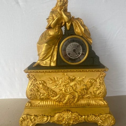 Antik fransk figurmantelur, ca. 1850–1900, i forgyldt bronze med hvid marmor eller alabaster, 8-dages mekanisk urværk, halvtime slag med én klokke, nøgle og pendel medfølger, mål: 25 × 33 × 13 cm, vægt 5 kg. Klik på den blå "gå til varen" knap, for at købe eller byde på denne vare. Den samlede pris vil blive vist inden du afgiver dit bud.