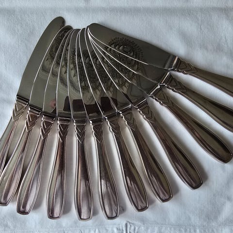 12 Christofle fiskemesser i modellen Pompadour. Dette elegante model kendetegnes ved sin asymmetriske roterende ornamentik af blade, et afdæmpet udtryk for Louis XV-stilen.