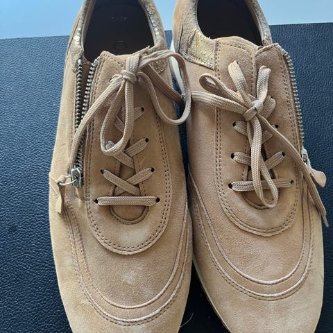 Gabor sneakers i str. 42. Skoene er i grå farve med velcrolukning over vristen og mønstret hælkappe. Ydersålen er lys med rillet bund. Velegnet som hverdagssko og fritidssko.