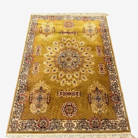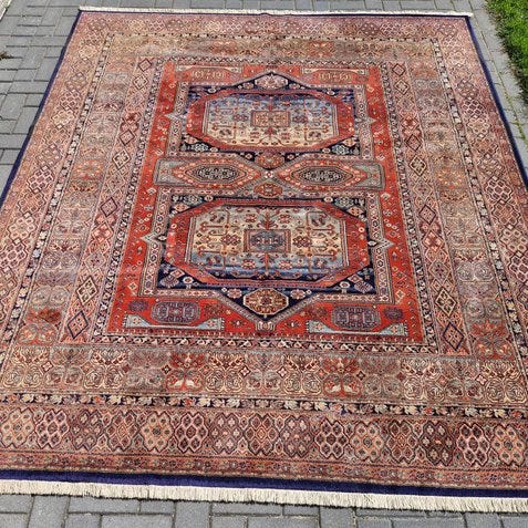 Smukt stort maskinvævet tæppe med et klassisk østlig medaillonmotiv og rig detaljeringsgrad. Tæppet har en varm farvekombination af røde-, beige- og mørkeblå nuancer, hvilket giver et elegant og tidløst udseende.