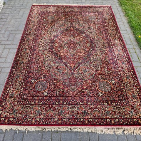Tæppet er i pæn stand med normale lette brugsspor, passende til brug.