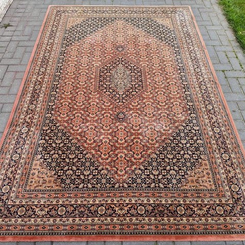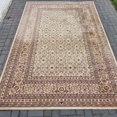 Maskinsyet overdådigt persisk-inspireret uldtæppe til gulvet med et rigt detaljeret centralt medaillon, placeret mod en varm gylden baggrund, indrammet af en indviklet blomsterkant i elfenben, rødbrun og dybblå nuancer. Det fint udførte mønster fremhæver klassiske svungne motiver og et symmetrisk design, og byder på en tidløs elegance, der passer til både traditionelle og moderne interiører.