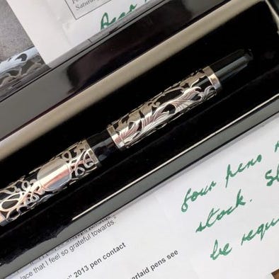 Fem Waterman-penne på en vintage-skærebræt, lavet i USA i første halvdel af det 20. århundrede, med materialer guld, forgyldt guld, sølv, celluloid og stål; hver penne er ca. 20 cm lang og 20 cm i diameter; god brugt stand med små tegn på ælde og pletter, ikke i funktion. Klik på den blå "gå til varen" knap, for at købe eller byde på denne vare. Den samlede pris vil blive vist inden du afgiver dit bud.