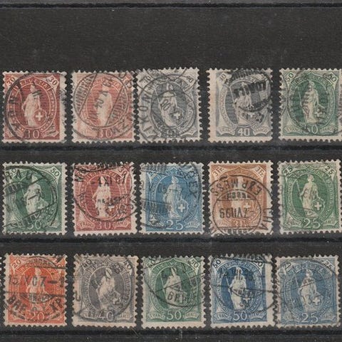 Schweiz, serien 'Helvetia mit Schwert' på glat papir, stemplet, fra 1940, SBK 113y og 140y–141y, uden certifikat eller ekspertunderskrift. Klik på den blå "gå til varen" knap, for at købe eller byde på denne vare. Den samlede pris vil blive vist inden du afgiver dit bud.