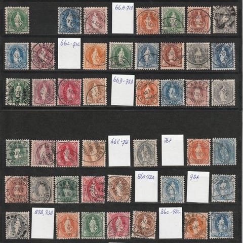 Schweiz 1882/1909 - Snuffelpartij med stående Helvetia på 38 små indstikskort.