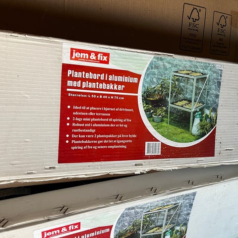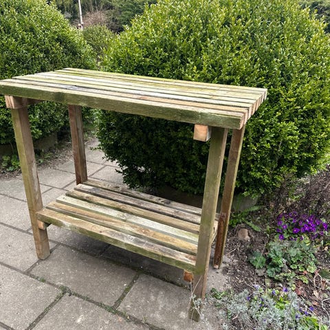 Plantbord i træ i sort farve. Bordet har en øverste bordplade med kanter og en hylde nederst med tremmer, som giver plads til opbevaring af potter, jord eller haveredskaber. Egnet til brug i drivhus, på altan eller terrasse som arbejdsbord til ompotning og plantearbejde.