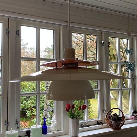 Louis Poulsen pendel designet af Verner Panton. Loftlampen er udført i metal og har flere skærme, der fordeler lyset nedad og til siderne. Farven fremstår som hvid/lys, og lampen er velegnet som belysning over spisebord eller i opholdsrum.
