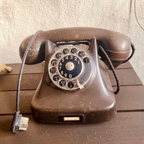 KTAS Telefon med drejeskive fra 1930,erne, lavet af jern med stofledning og stik