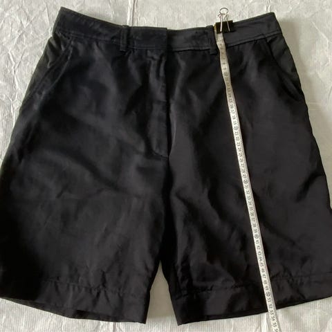 Rigtig pæne sorte shorts i god kvalitet med 2 skrålommer for på og 2 lommer bagpå. Har lllle ben med opslag. skridtlængde 21 cm