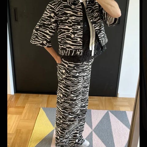 Coster Copenhagen sæt bukser og puffer jakke i Field print. Jakken er size 34 men stor og passer en 36 . Bukserne er str. 36. Bukserne er nye med prismærke. Jakken har været brugt ved 1 anledning. Nederste knap virker men den mangler en skive. Ingen betydning for funktionen. Jakken har kostet kr 1.300 og bukserne har kostet kr 1.000,- Sættet har et grafisk field print i lyse kontrastfarver og lige ben. De er fremstillet i en let og behagelig ecovero og viskosekvalitet, der egner sig til hverdagsbrug såvel som mere pæne anledninger. Passer til kvinder og kan styles op og ned.