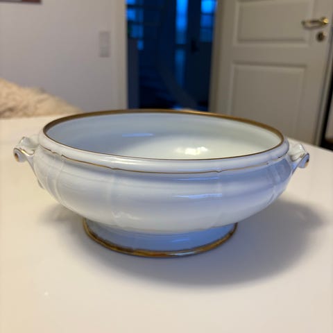 Materiale: Hvidt porcelæn med dekoration af burresnerre og guldkant.