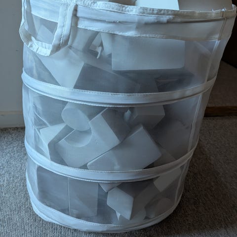 Store byggeklodser i plast i flere farver, herunder gul, grøn, blå og rød. Klodserne er i ekstra stor størrelse og egner sig til leg og byggeri for børn, hvor de kan stables og samles til forskellige konstruktioner. Plastmaterialet gør dem lette at rengøre og anvende både inde og ude, afhængigt af underlag og behov.