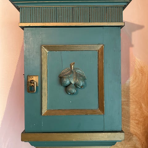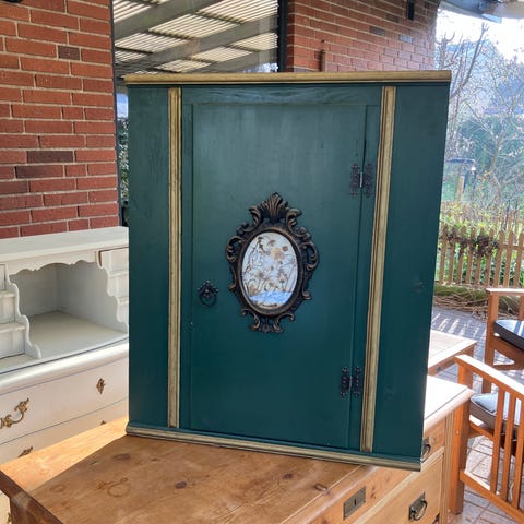 Vægskab i træ med glaslåge - malet i blå farve. Skabet har buede hylder indvendigt.